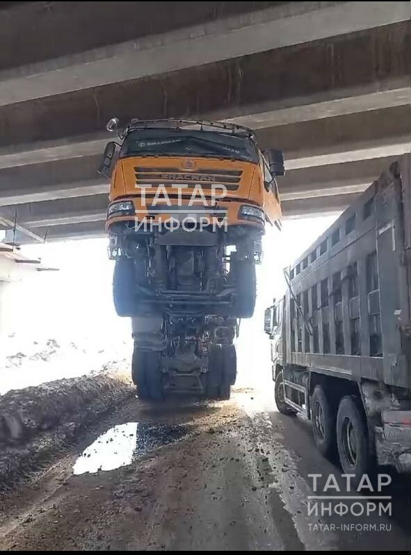 На видео сняли, как под Челнами самосвал не вписался под мост и застрял