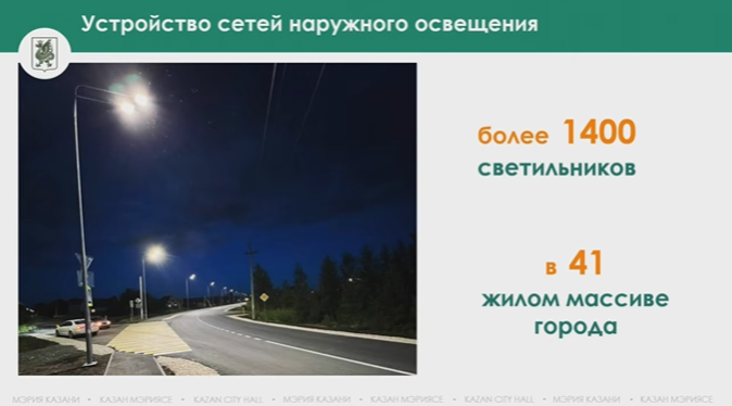 «В этом году благодаря поддержке Раиса Татарстана Рустама Минниханова продолжается реализация программы восстановления дорожного освещения в поселках Казани. Запланировано смонтировать более 1,4 тыс. светодиодных энергосберегающих светильников в 41 жилом массиве города на сумму более 40 млн рублей, — сообщил он.