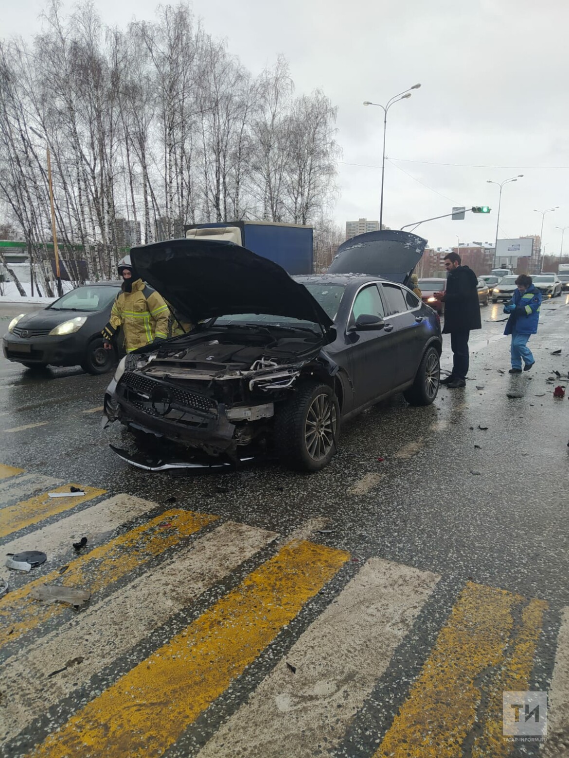 Сегодня на улице Залесной в Казани столкнулись два автомобиля – Mercedes и Hyundai. От сильного удара у первого автомобиля серьезные повреждения корпуса спереди, а у второго – сзади.