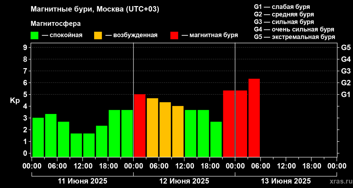 По информации специалистов, буря началась с 23 часов 12 июня по московскому времени. При этом «балл события G2.3 находится выше среднего уровня и превышает порог, начиная с которого становится заметно влияние на энергетические системы и на распространение радиоволн».