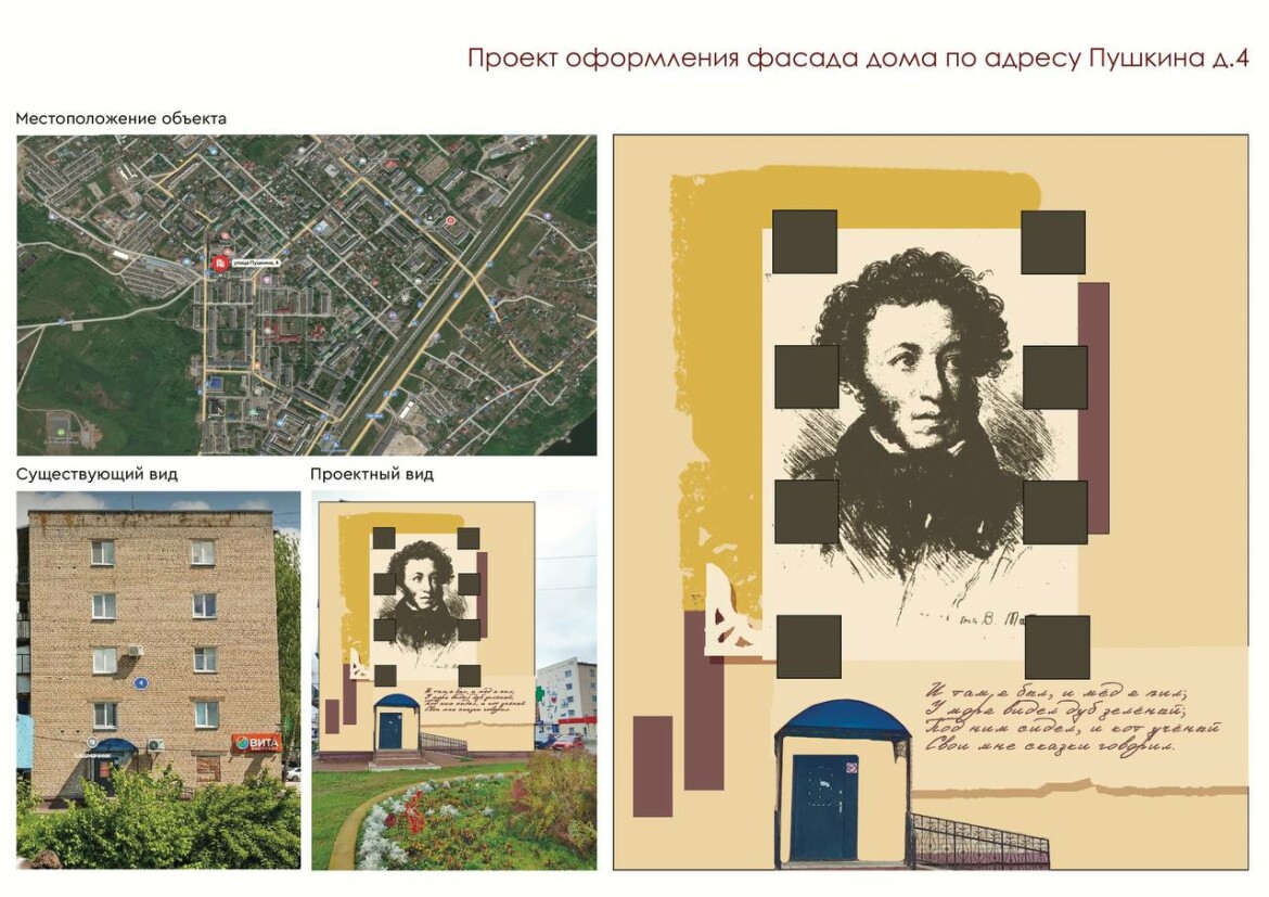 Так, на доме №17 по улице Фомина жителей и гостей будет радовать историческое изображение города; на Пушкина, 4 появится портрет русского классика, дом №1 по улице Чоловского украсит изображение заслуженного врача РСФСР Ефима Чоловского.