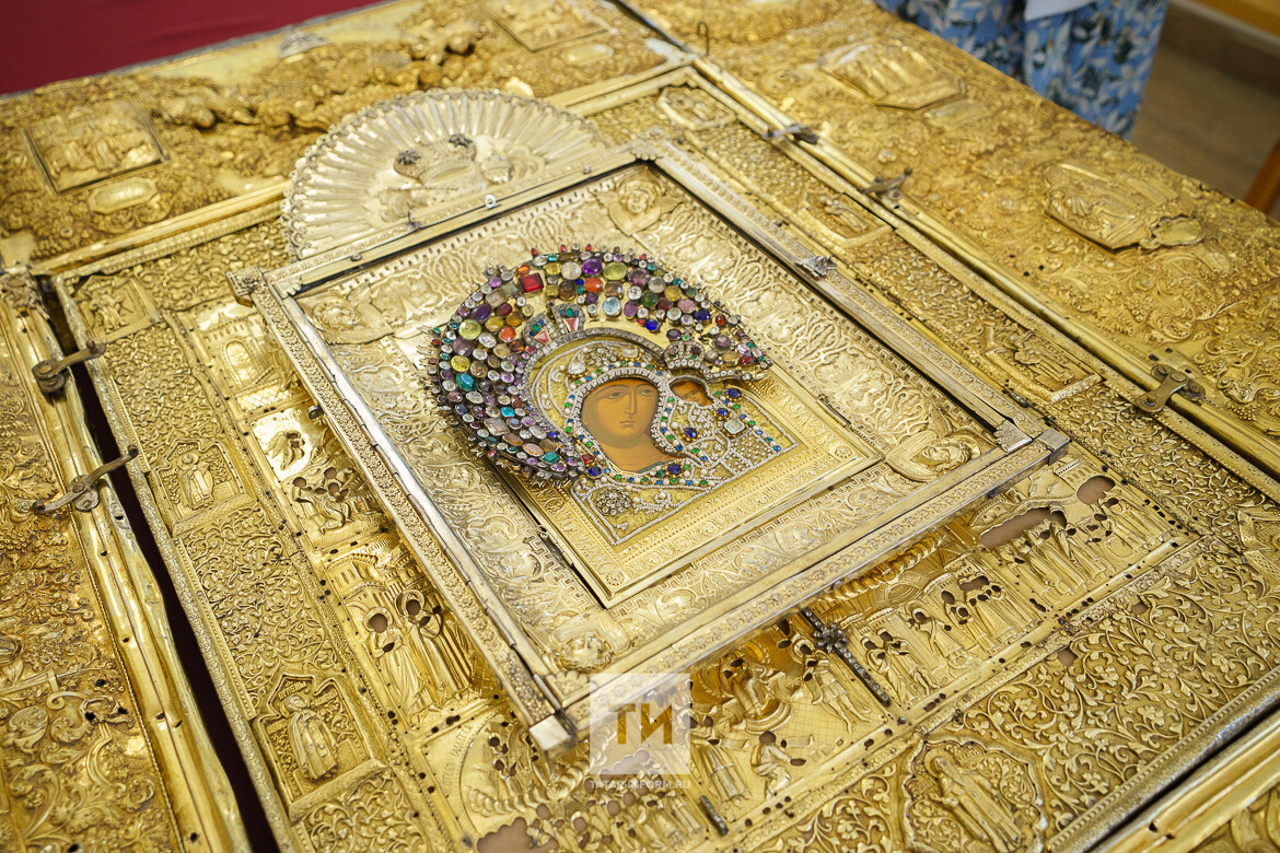 Она пояснила, что комплекс включает шесть составляющих: внешняя рама-оклад, средник, киот к иконе Казанской Божией матери, рамка-крепление, оклад, обрамляющий саму икону, и тканевая риза. Он хранился в специальном отделе в Нацмузея республики, но сейчас, в связи с открытием вновь построенного собора Казанской иконы Божией матери, его на год отдали во временное хранение Казанской епархии.