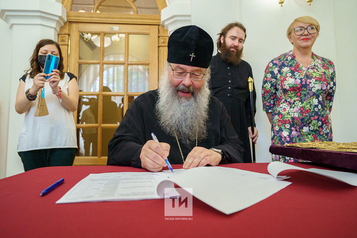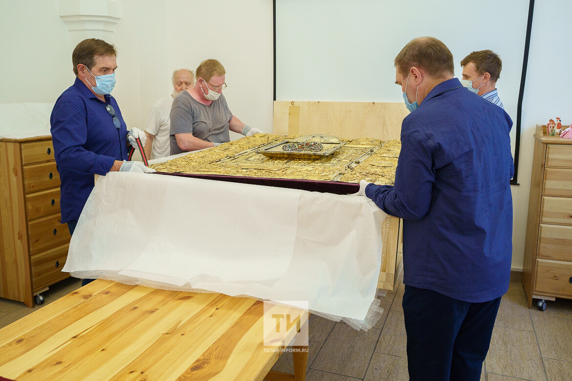 Из Национального музея Татарстана Казанской епархии передали ризу-оклад Казанской иконы Божией матери. Комплекс из шести предметов перевезут в отреставрированный собор, церемония освящения которого пройдет 21 июля.