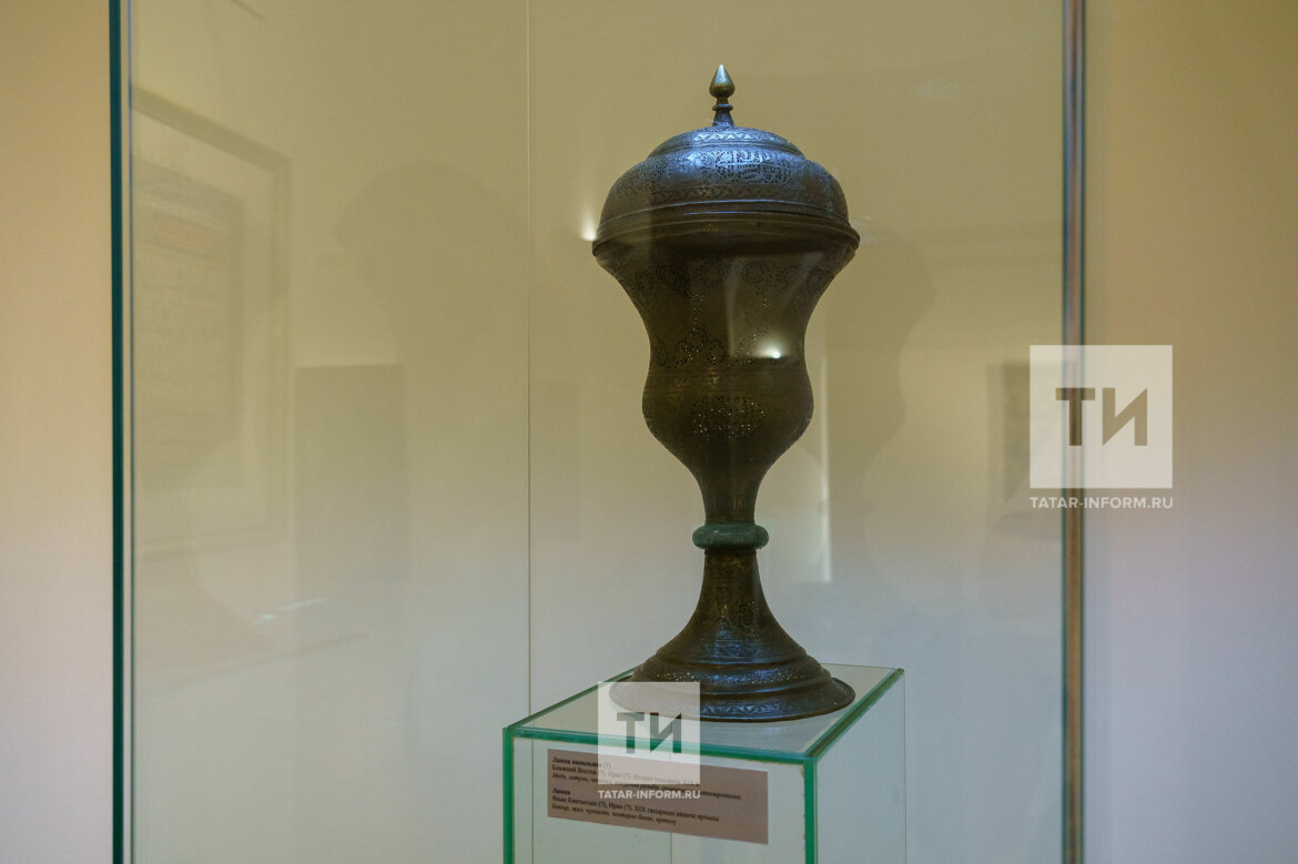 Большая ажурная лампа из бронзы — по всей видимости, ближневосточная работа XIX века, которую сделали для продажи на иранском рынке. В витринах выставки музейщики разместили только одну, на самом деле это парный предмет декора интерьеров. Вторая также есть в фондах Национального музея РТ, но находится на реставрации.