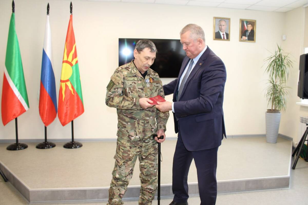 Сегодня в Заинске участнику специальной военной операции Сергею с позывным Старый вручили медаль «За отвагу». Награду на 50-й встрече с бойцами СВО передал глава района Разиф Каримов. Сергею 53 года, на СВО он ушел по контракту в сентябре 2024 года.