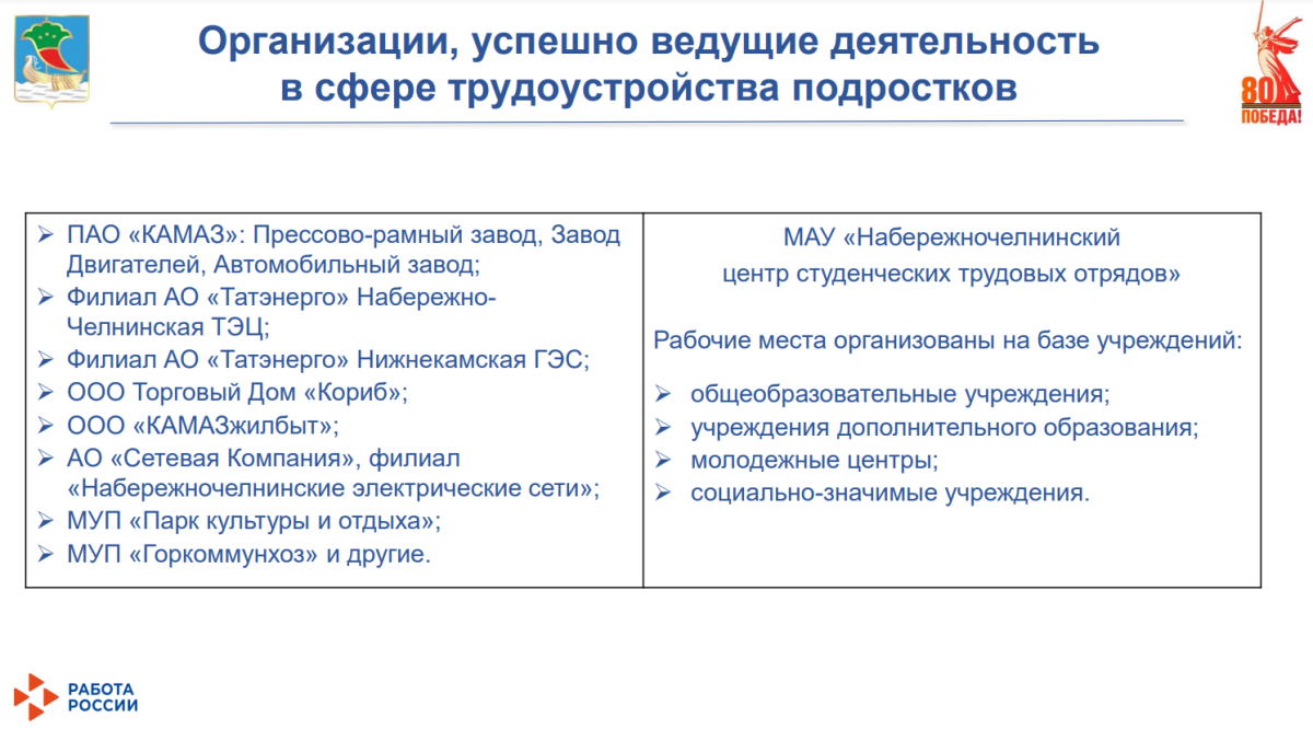 Активно принимают участие в трудоустройстве подростков такие предприятия и организации, как подразделения ПАО «КАМАЗ» – Прессово-рамный завод, Завод Двигателей и Автомобильный завод, филиалы «ТАТЭНЕРГО» – Набережночелнинская ТЭЦ и Нижнекамская ГЭС, Торговый дом «Кориб», «Камазжилбыт», «Сетевая компания» (филиал Набережночелнинские электрические сети), «Парк культуры и отдыха», «Горкоммунхоз» и другие.