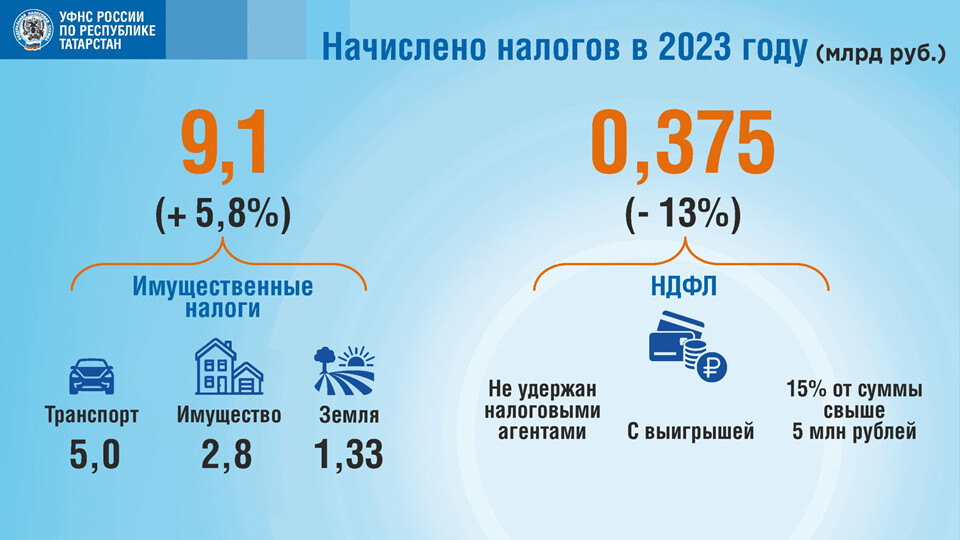 «Мы должны собрать 9,1 млрд рублей: это транспорт – 5 млрд, налог на имущество физлиц – 2,8 млрд и земельный налог – 1,3 млрд рублей», – рассказал Сафиуллин.