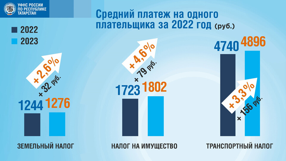При этом средний платеж в Татарстане по налогу на имущество физлиц составляет 1802 рубля, по транспортному – 4896 рублей и земельному – 1276 рублей.