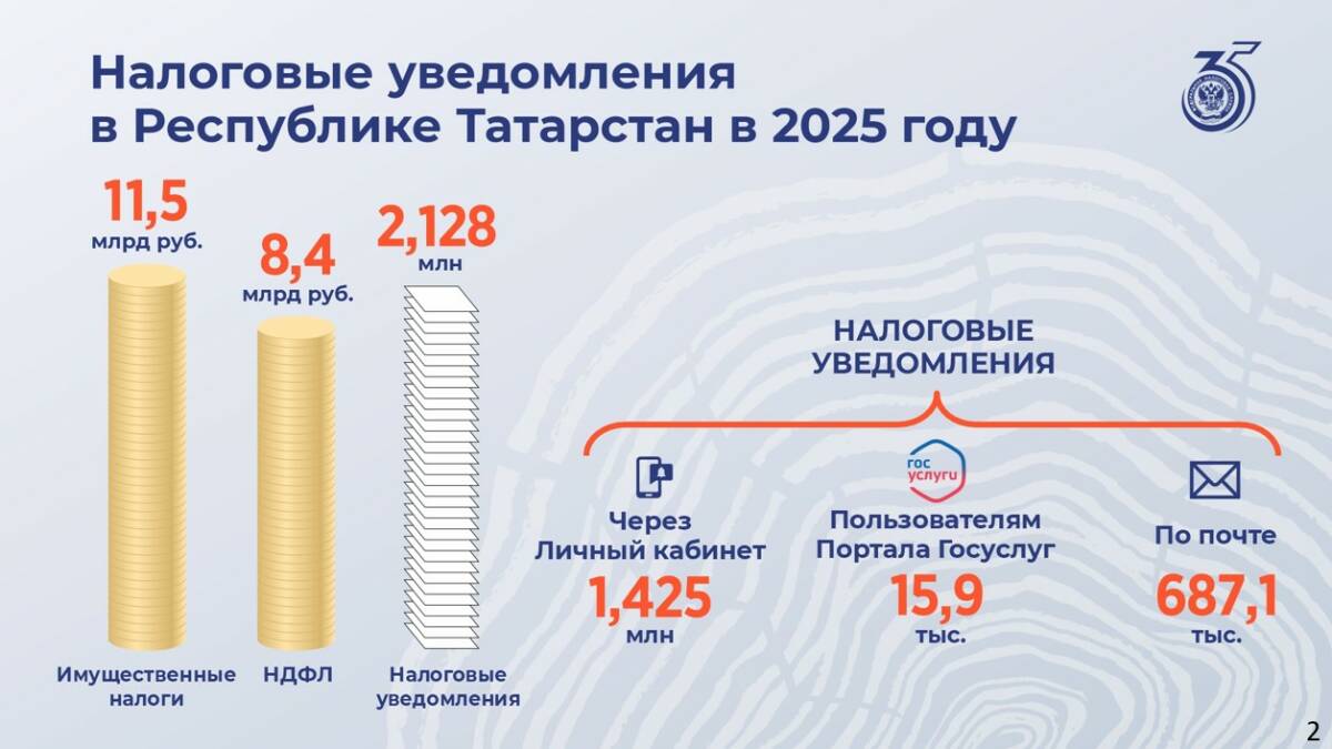 В этом году крайний срок уплаты имущественных налогов за 2024 год – 1 декабря. Всего жителям республики направили свыше 2,1 млн налоговых уведомлений на общую сумму 11,5 млрд рублей – на 18% больше, чем годом ранее. Об этом сегодня на брифинге в Доме Правительства РТ сообщил руководитель УФНС по республике Марат Сафиуллин.