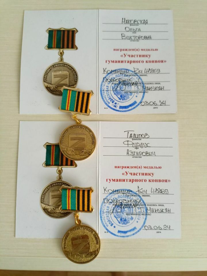 3 июня 2024 года Ольга Маковская и Фирдус Талипов награждены Государственной медалью «Участнику гуманитарного конвоя» от Минобороны Российской Федерации.
