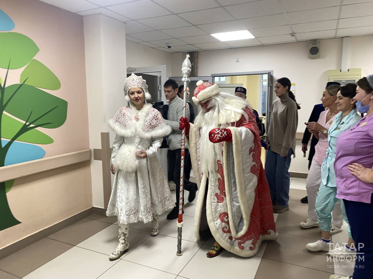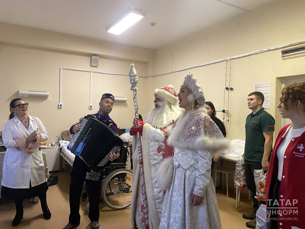 Сегодня в военный госпиталь при Республиканской клинической больнице пришел праздник. К военнослужащим, находящимся на лечении, приехали Дед Мороз и Снегурочка. Под аккомпанемент баяна они исполнили новогодние песни и вручили бойцам сладкие подарки.