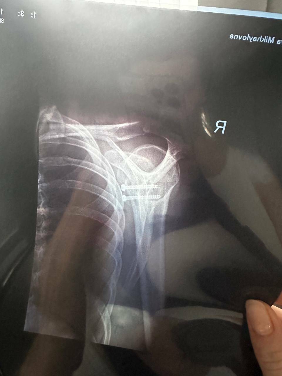 Она опубликовала рентген-снимок, на котором видны два винта, установленные в кость правой руки.