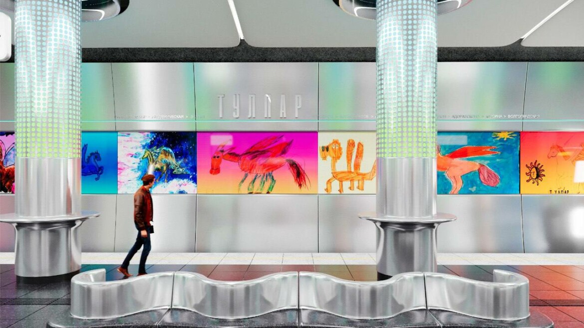Интерьер станции «Тулпар» (бывшее название «Академика Сахарова») минималистичен, но будет выглядеть сказочным благодаря мягкой светодинамической подсветке колонн. В его основу легла не сама конкурсная работа, а идея оформления детскими рисунками. Один тематический конкурс — «Тулпар — сказочный конь» уже состоялся. Ближе к непосредственной работе над интерьерами, заметила Валеева, могут провести еще несколько, так как на станции будет много локаций для экспозиции.