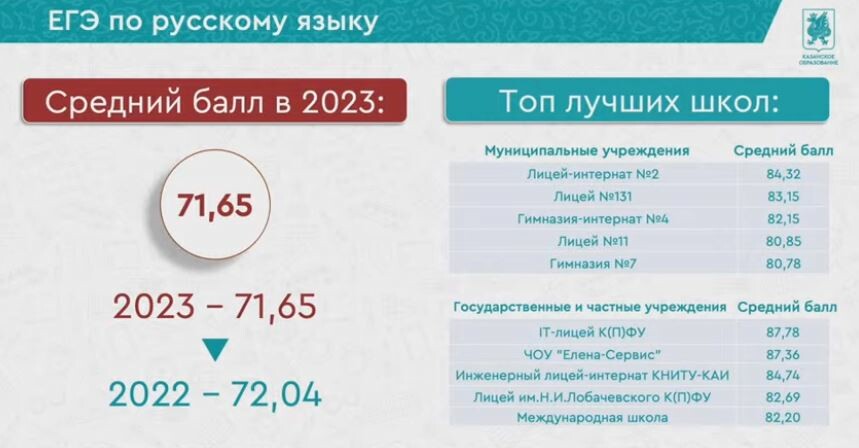 Среди государственных и частных учреждений при сдаче русского языка отличились IT-лицей КФУ — 87,78 балла, ЧОУ «Елена-Сервис» — 87,36 балла и инженерный лицей КНИТУ-КАИ — 84,74.