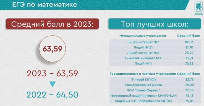 В топ школ ЕГЭ по математике вошли лицей-интернат №7, лицей №131, лицей-интернат №2, гимназия-интернат №4, лицей №11. Среди государственных и частных учреждений выделяются IT-лицей КФУ, Международная школа, ЧОУ «Елена-Сервис».