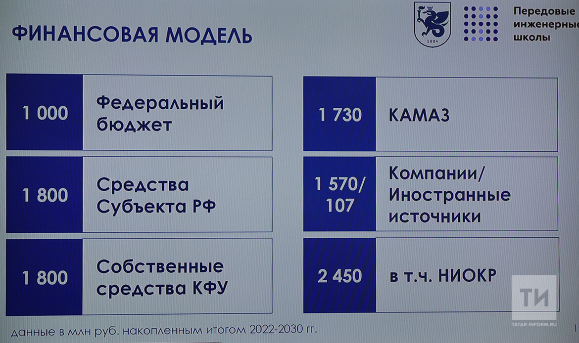 Стоимость создания передовой инженерной школы «Кибер Авто Тех» оценивается в 8 млрд рублей до 2030 года. В том числе из федерального бюджета будет выделен 1 млрд рублей, из бюджета Татарстана – 1,8 млрд рублей, собственные средства КФУ составят так же 1,8 млрд рублей, еще 1,7 млрд рублей выделит КАМАЗ и 1,6 млрд – иные компании, в том числе за счет финансирования научно-исследовательских и опытно-конструкторских работ.