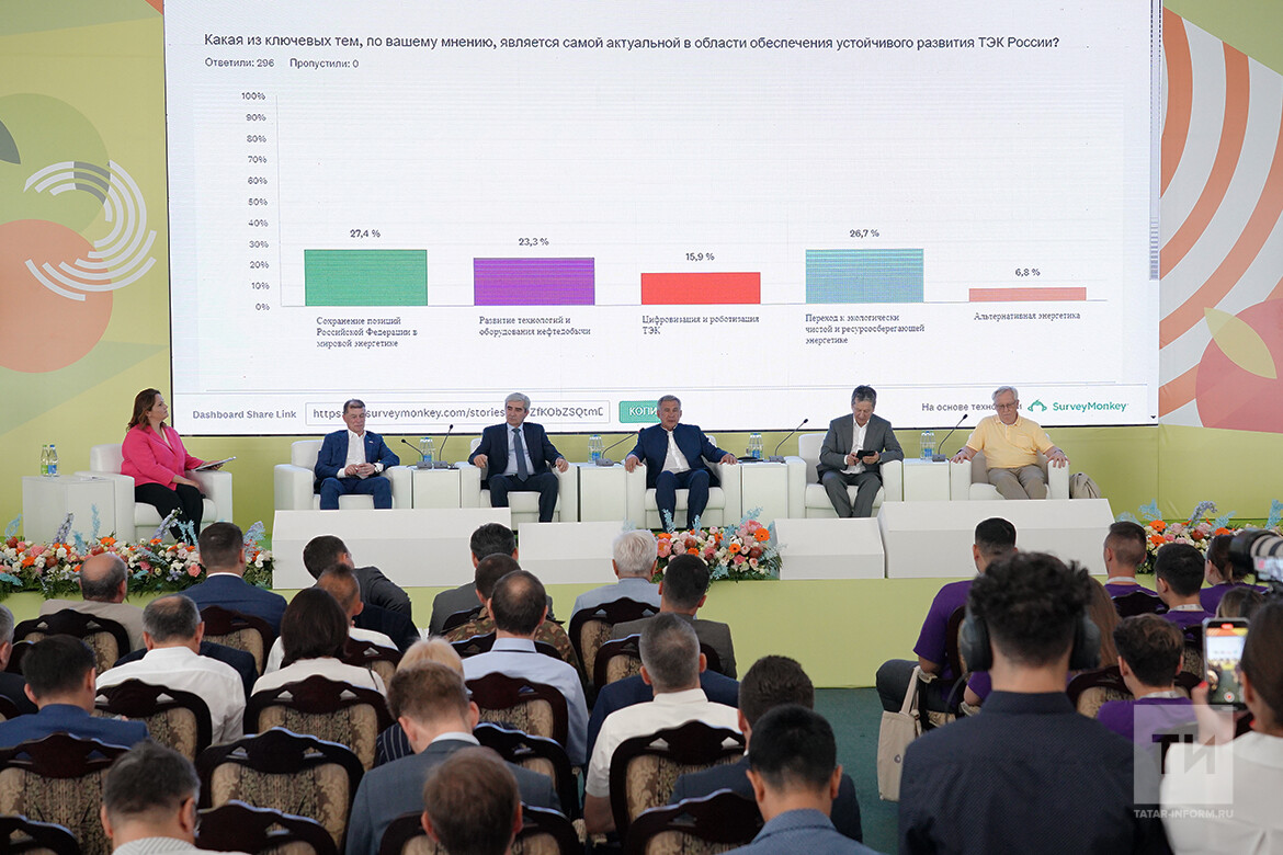 Участники форума через мобильные телефоны выбрали один из вариантов ответов. Больше всего – 27,4% отдали голос за то, что России нужно сохранить позиции в мировой энергетике, 26,7% считают, что нужно переходить к экологически чистой и ресурсосберегающей энергетике, 23,3% полагают, что самое время развивать технологии и оборудование для нефтедобычи, 15,9% – за цифровизацию и роботизацию ТЭК и лишь 6,8% – за альтернативную энергетику.