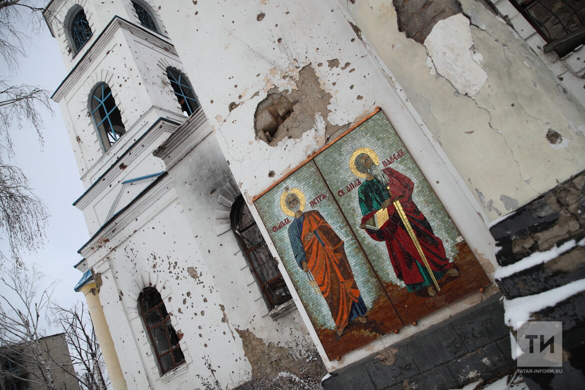 Следующий снимок на выставке – израненный осколками от снарядов храм. Удивительно, но в почти полностью разрушенной после обстрелов обители практически невредимыми остались образы Святых Петра и Павла, выполненные на стене мозаикой.