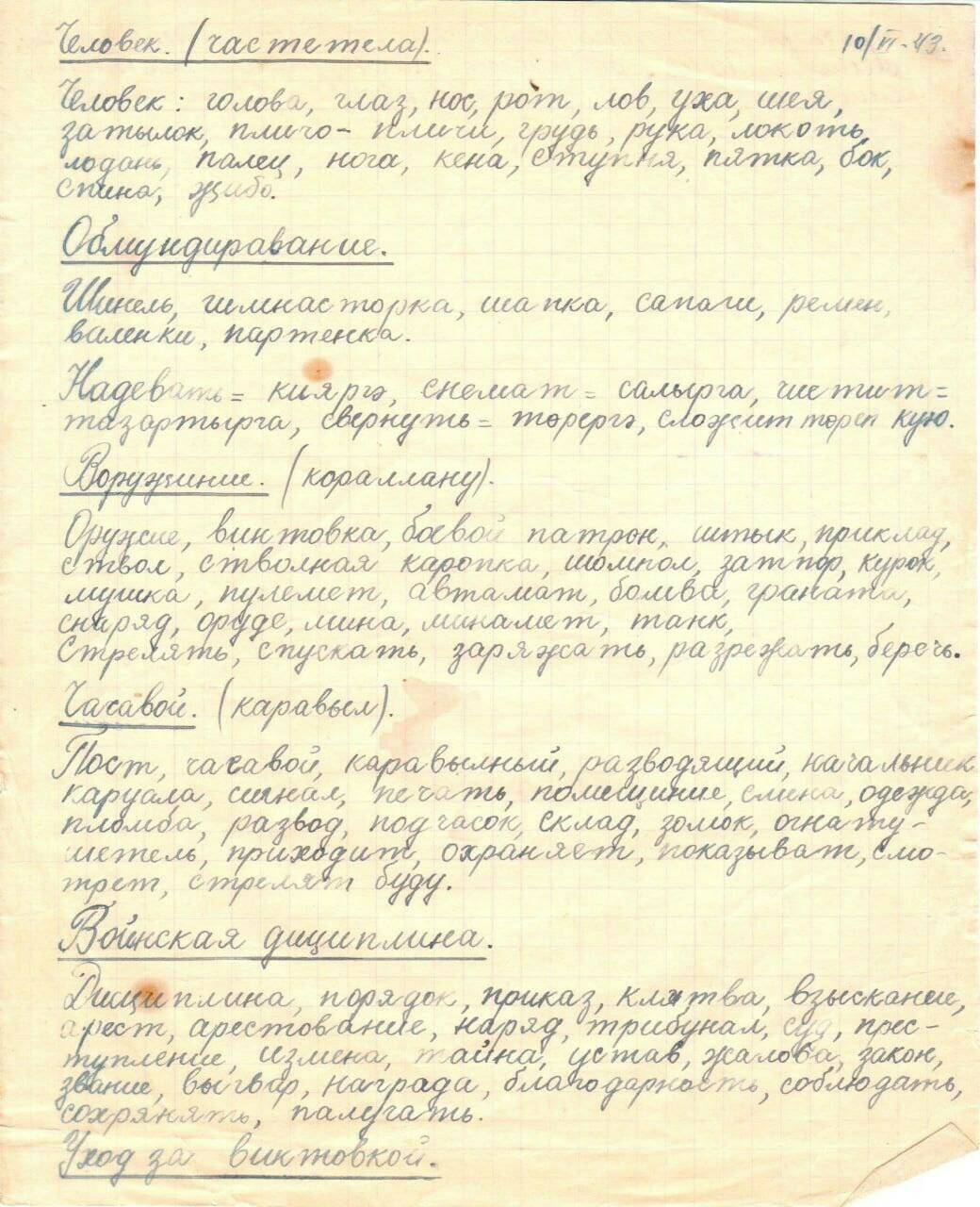 Я как-то публиковал документ из личного семейного архива о том, как мой дед проходил допризывную подготовку. Он записывал на листочке термины, которые должны были пригодиться ему при службе в армии. По тому, как они записаны, понятно, что записывалось на слух. Русский язык он также выучил в большей степени уже на фронте.