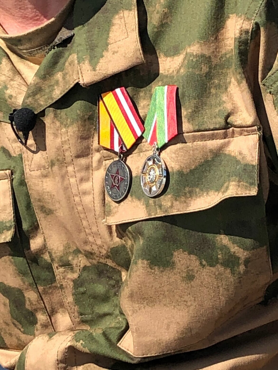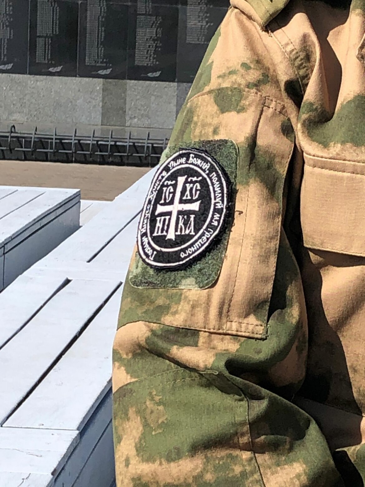 «Мне 43 года. Сейчас вспоминал, время летит просто быстро. Помните, где фотографию вам скинул, где порванное было. Вот этот шеврон оттуда у меня. Это к нам батюшка приезжал с Пензы, батюшка Андрей. Вот он нам раздавал эти шевроны. И вот это для меня тоже оберег, и я его с собой ношу всегда. Если посмотреть, там даже маленькие дырочки есть от осколков», — сказал он.