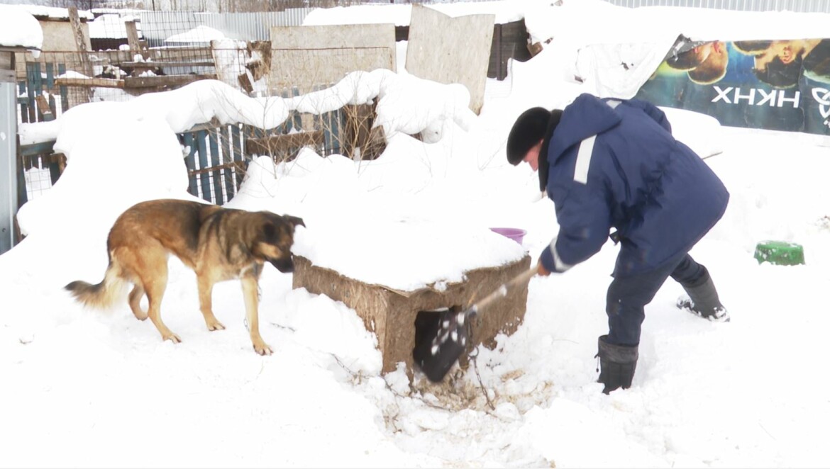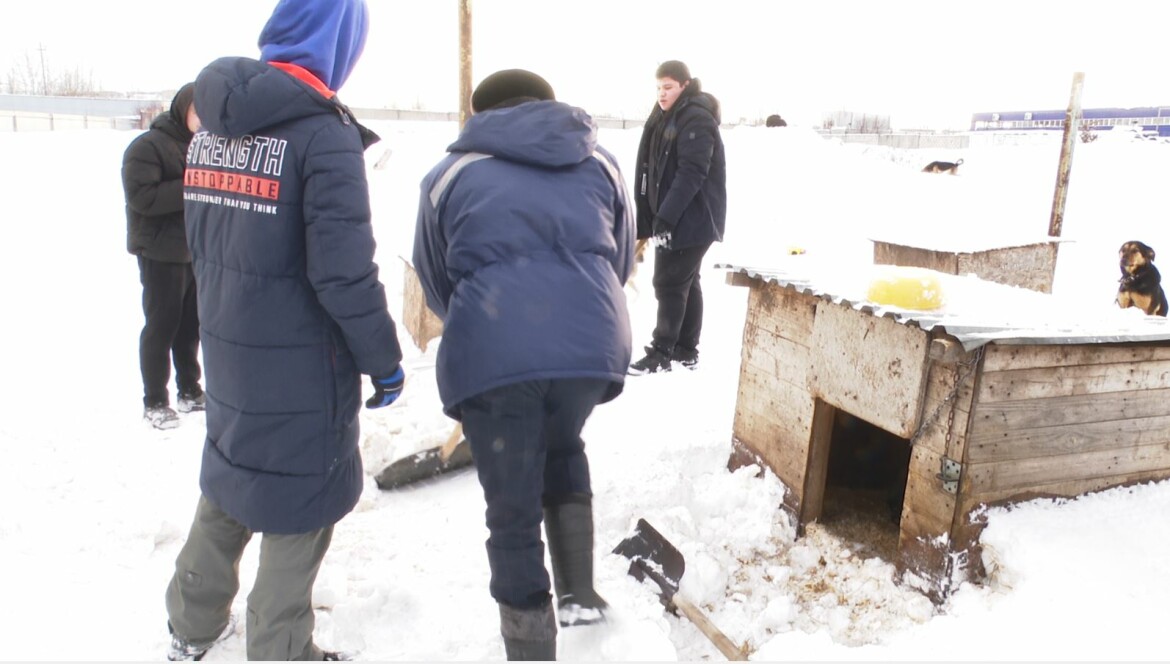 Нижнекамские студенты очистили занесенные снегом будки животных в приюте