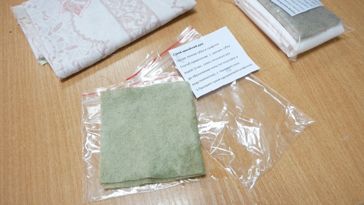 Прозрачный пакетик с двумя тряпочками и инструкцией — так выглядит готовый к использованию сухой душ. Изготавливать его несложно, заверили волонтеры. Когда бойцу нужно привести себя в порядок, а воды рядом нет, этот пакетик приходит на помощь.