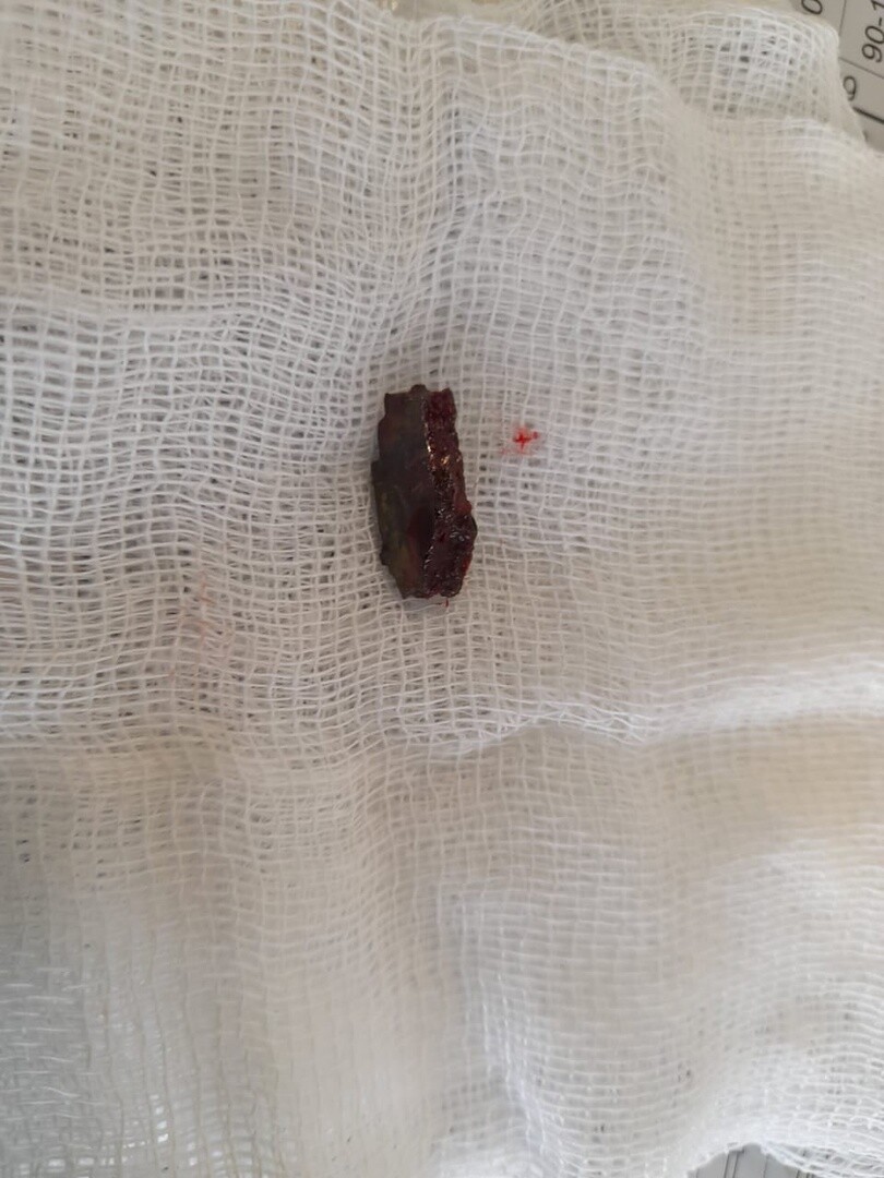 «Я расширил отверстие в лопатке и извлек осколок, во время операции пришлось использовать магнит, помогли металлические зажимы. Операция продлилась почти полтора часа. Осколок оказался небольшим, около двух сантиметров в длину и один сантиметр в ширину. Болевой синдром у пациента был из-за того, что инородное тело находилось рядом с сосудисто-нервным пучком», – рассказал хирург.