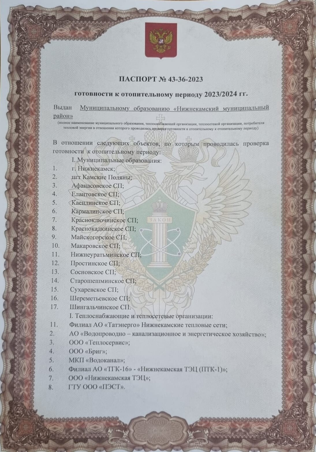 Нижнекамский район РТ получил паспорт готовности к отопительному сезону