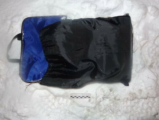 Во время осмотра места происшествия стражи порядка нашли личные вещи преступника, которые тот оставил на снегу: мобильный телефон и сумка.