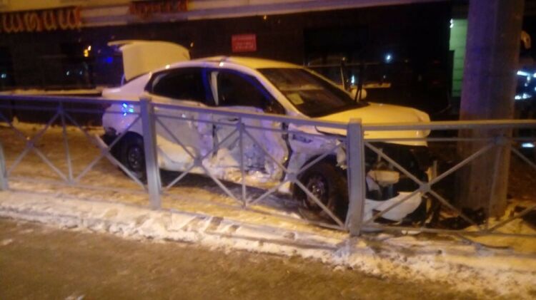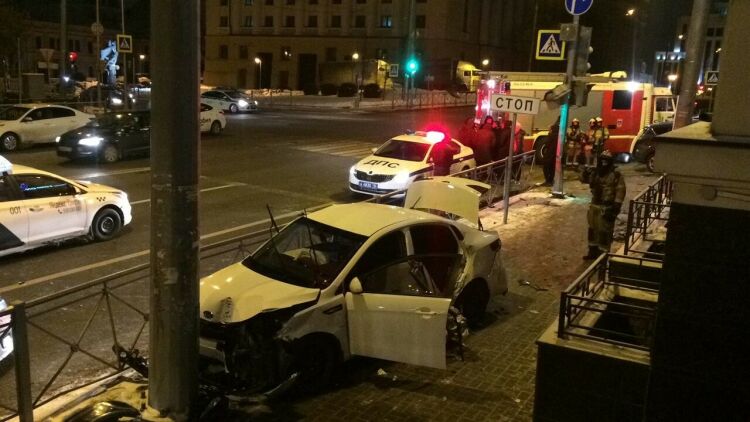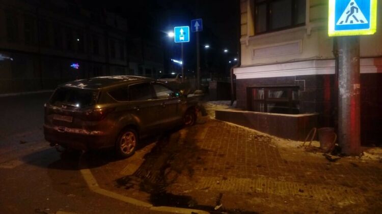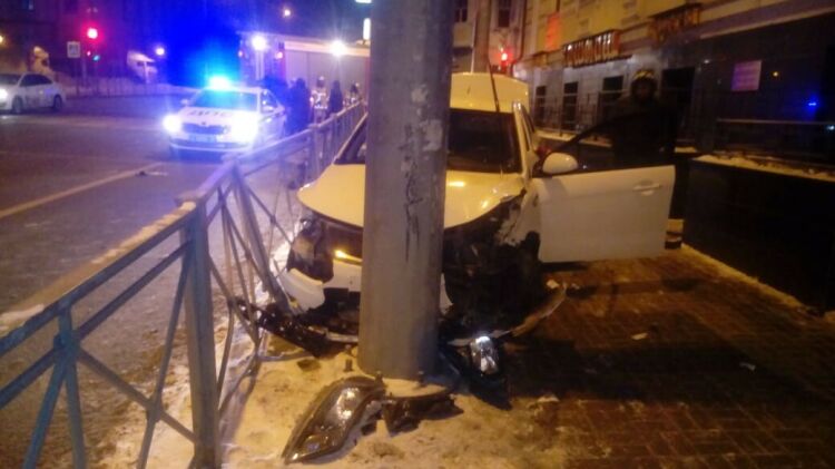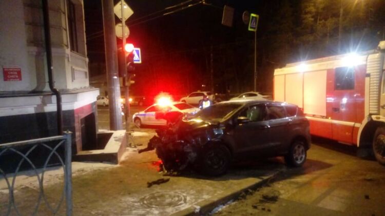 Ночью в центре Казани легковушка после ДТП вылетела на тротуар и врезалась в столб