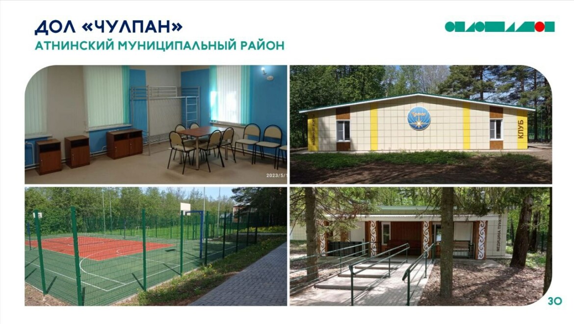 В этом году после капремонта в Татарстане откроют два лагеря. Детский оздоровительный лагерь «Чулпан» в Атнинском районе обветшал и долгое время не работал. В нем проведен ремонт столовой, спальных корпусов, медпункта, клуба и дома охранника. Здесь построена современная спортивная площадка и благоустроена территория. В этом году в лагере планируется проведение нескольких смен продолжительностью 7 и 18 дней.