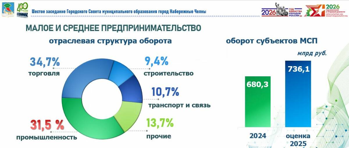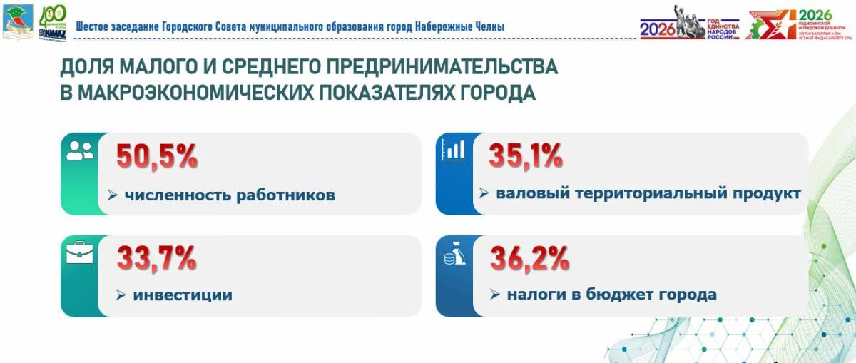 В сфере малого и среднего бизнеса в Набережных Челнах занято 144 тыс. человек. Оборот предприятий вырос на 8% и достиг 736 млрд рублей. «Активно развиваться малому и среднему бизнесу помогают федеральные и региональные программы. Наши предприниматели смогли воспользоваться мерами поддержки на общую сумму более 14 млрд рублей. Малый и средний бизнес – это фундамент устойчивого развития экономики нашего города, и поэтому наша задача – оказывать ему всестороннюю помощь», – подчеркнул Наиль Магдеев.