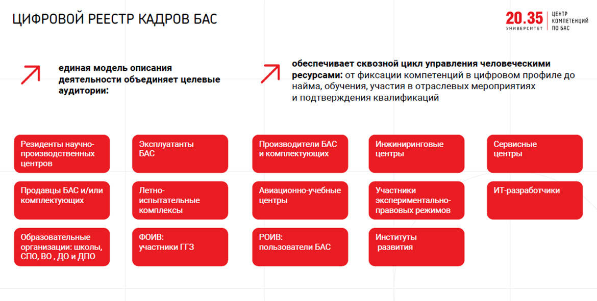 Начальник отдела продуктового развития Центра компетенции БАС Дмитрий Аликин сообщил, что реестр кадров – это, прежде всего, единая экосистема, платформа, объединяющая в себе как новичков в этой отрасли, которые, например, хотят сменить профессию, так и профессионалов. По его мнению, реестр даст этим людям возможность продемонстрировать свои навыки и получить мотивацию, просматривая резюме других специалистов.