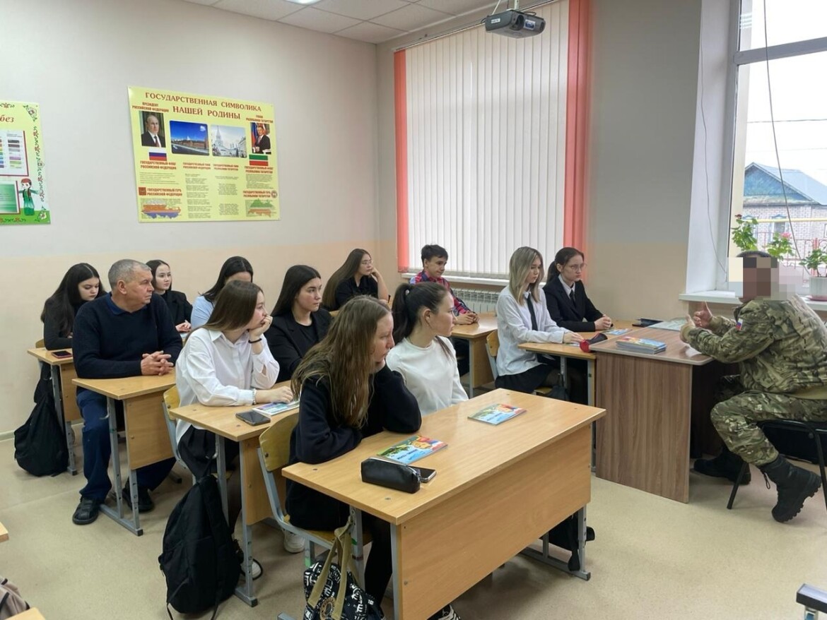 В гости к ученикам 9-го класса школы № 2 города Мензелинска пришел участник СВО. В отпуске боец решил навестить родную школу, пообщаться с подрастающим поколением.