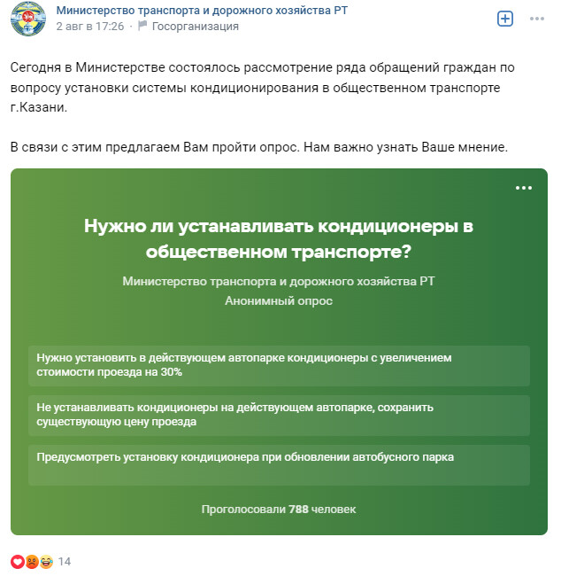 «Очень своевременный опрос! Лето заканчивается. Нужны не только кондиционеры, но и новые автобусы, это должно быть понятно городским властям и без опроса горожан. Стыдно», – написал пользователь «ВКонтакте» под опросом в группе Минтранса.
