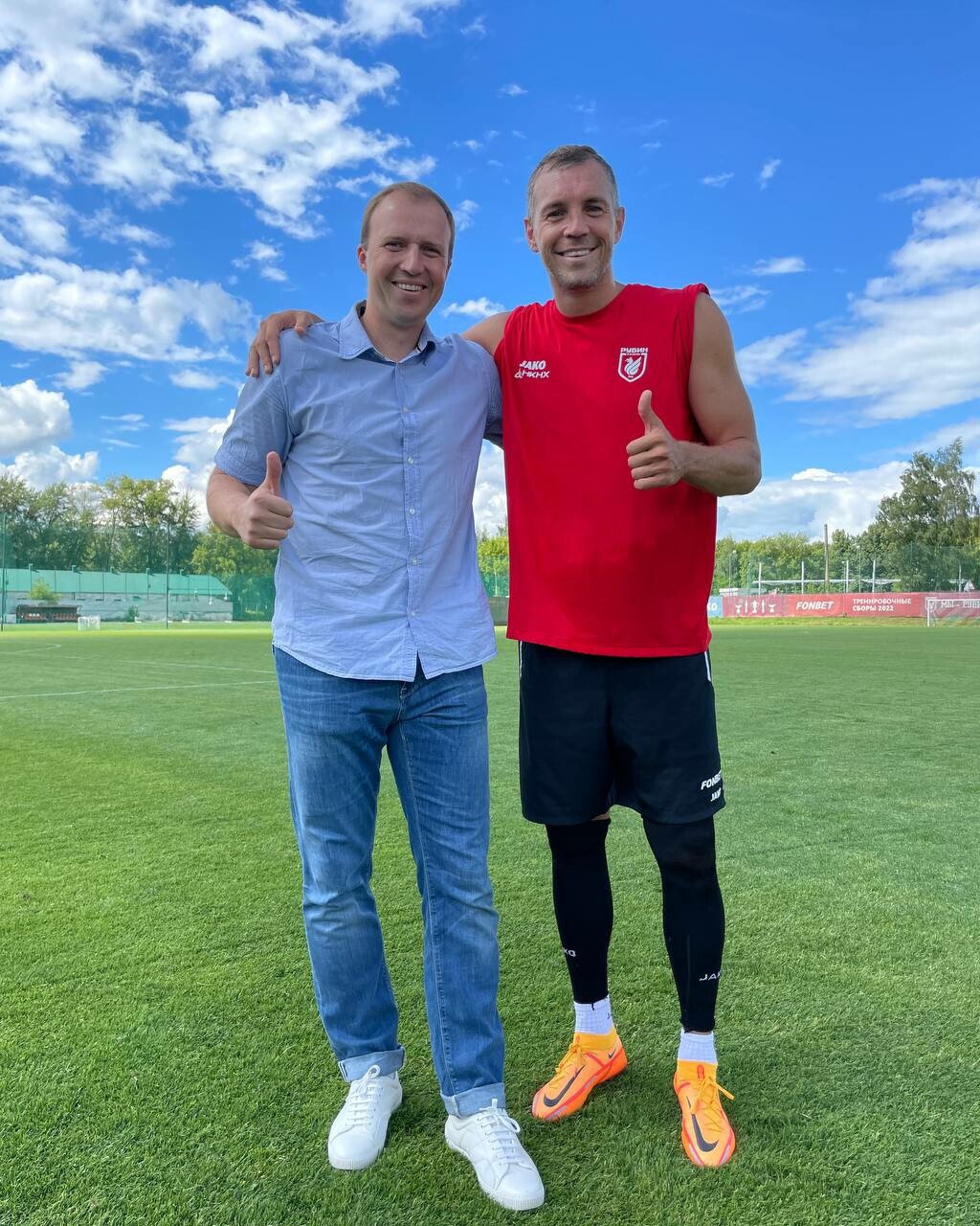 «Рубин» опубликовал фотографию с тренировки основной команды, на которой запечатлены бывший нападающий «Зенита» Артем Дзюба, а также исполнительный директор казанского клуба Константин Дзюба.