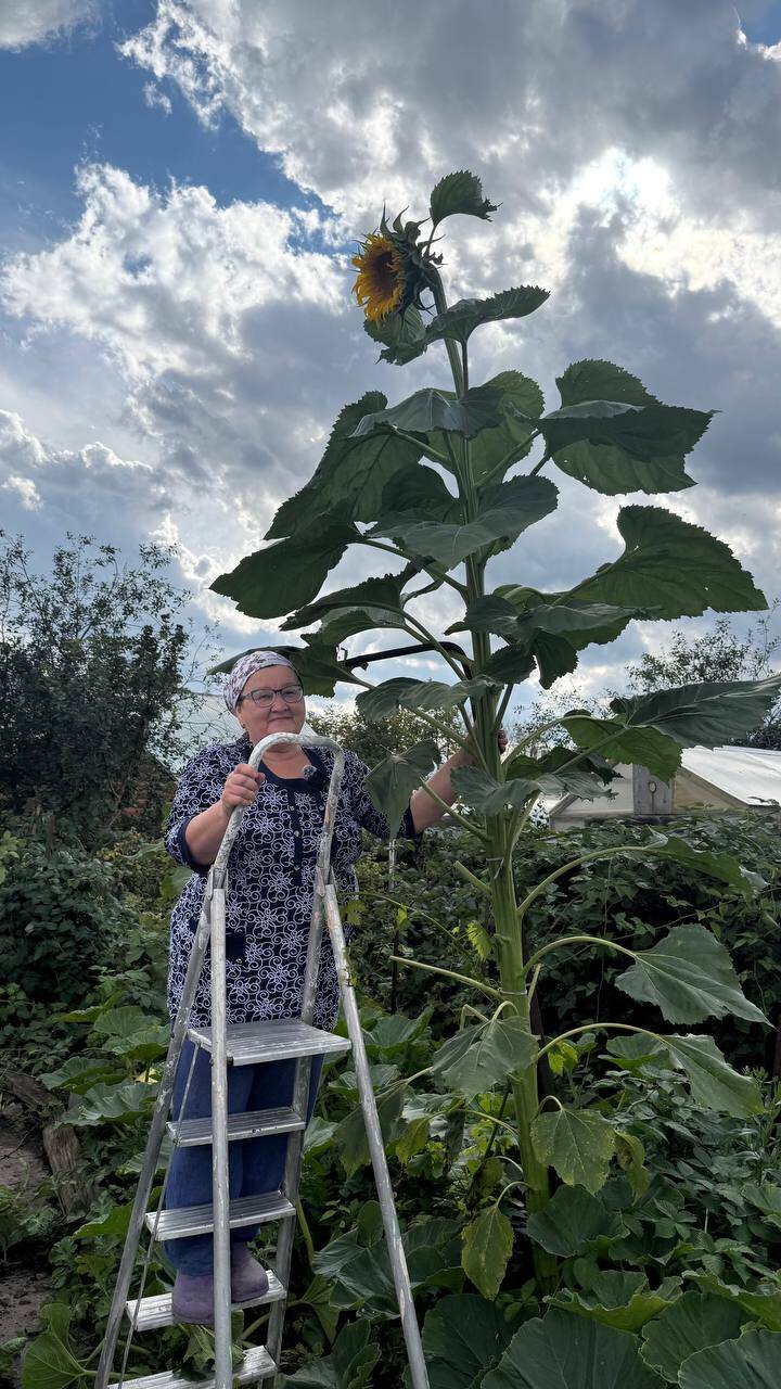 «В социальных сетях блогеры рассказывают о подсолнухах-гигантах. Заинтересовалась и решила попробовать сама. Через маркетплейс заказала семена – пришло три штуки, два из них взошли. Один вырос огромным, второй поменьше, – рассказывает Альфия Гафурова. – Лето было дождливое, да и с высадкой в грунт припозднилась, поэтому подсолнух зацвел поздно, только к концу лета. Но если сентябрь будет теплым, надеюсь, он еще созреет и порадует урожаем».
