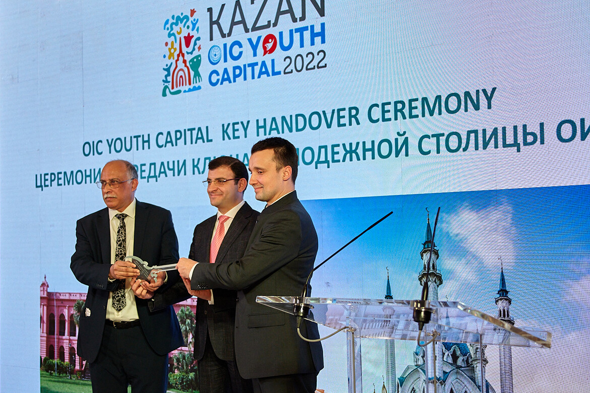 В завершение церемонии чрезвычайный и полномочный посол из города Даха (Бангладеш) Камрул Охсан и генеральный директор молодежного форума ОИС передали Казани эстафету, вручив золотой ключ министру по делам молодежи РТ Тимуру Сулейманову. Символ организации ранее уже успел побывать в Стамбуле (Турция), Ширазе (Иран), Путраджае (Малайзия), Фесе (Марокко), Дохе (Катар) и других городах исламского мира.