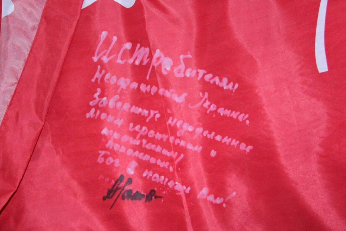 «Истребителям неофашистов Украины! Завершите недоделанное моим героическим и трагическим поколением! Бог в помощь Вам!» — написал он на знамени.