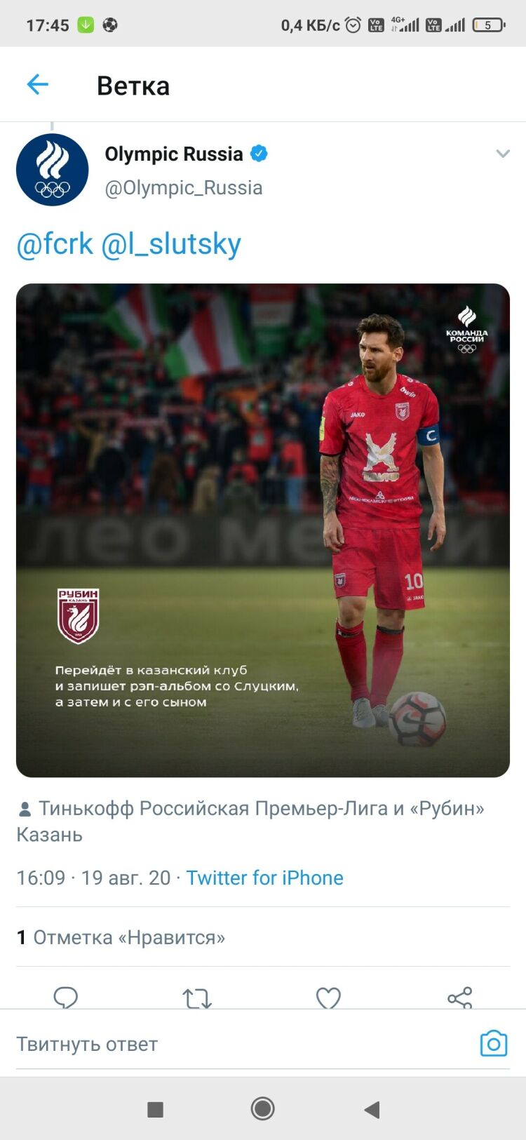 (Казань, 19 августа, «Татар-информ»). Пресс-служба Олимпийского комитета России опубликовала весьма неоднозначное сообщение на своей странице в сети Twitter, пошутив насчет перехода капитана «Барселоны» Лионеля Месси в «Рубин».