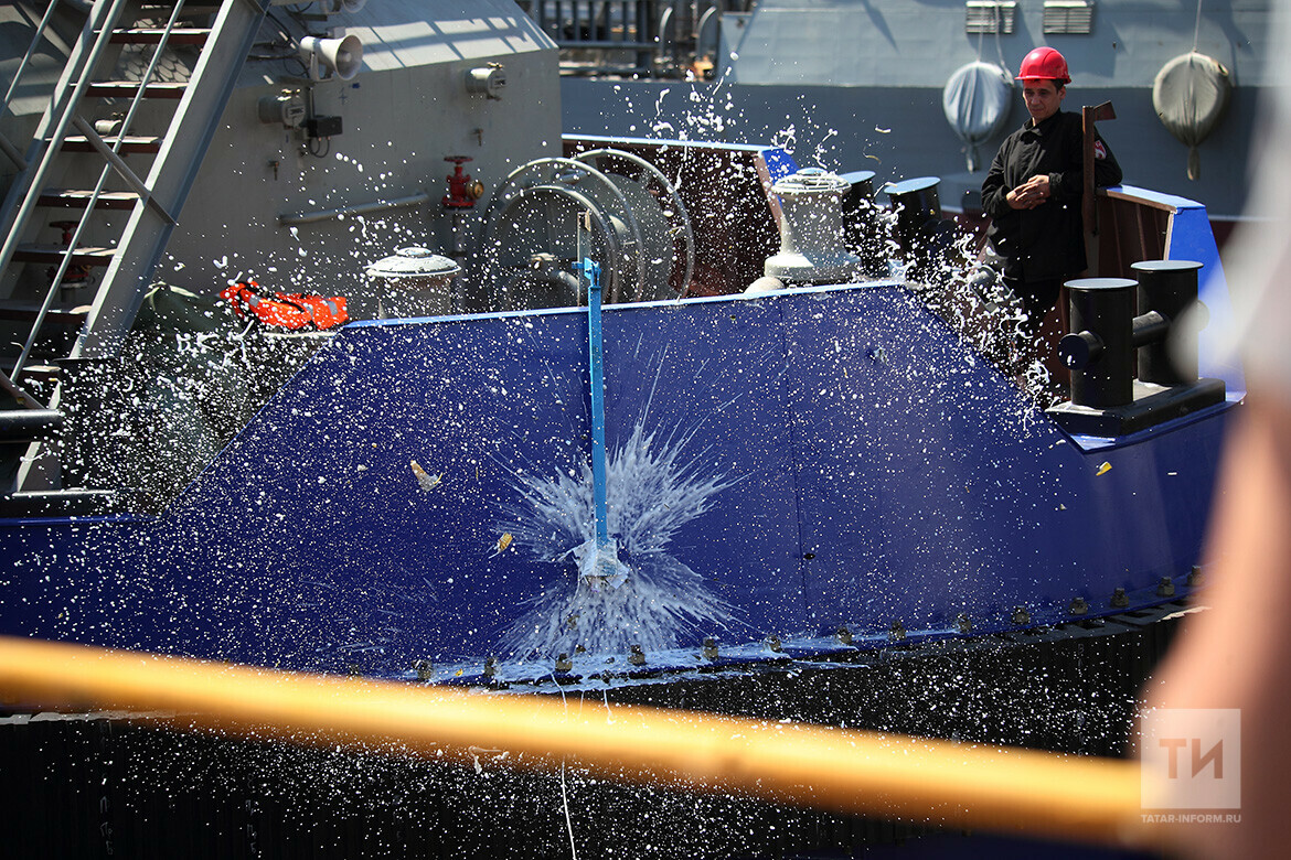 Торжественная церемония спуска корабля на воду не обошлась без традиционного ритуала. Судну выбрали крестную мать, и она разбила о его борт бутылку шампанского
