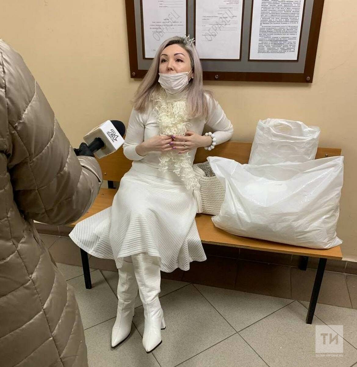 К 40-летней Лейсан Бочкаревой сегодня в Вахитовском районном суде Казани было приковано все внимание журналистов. Сначала женщина была настроена негативно, отказывалась общаться, просила ее не снимать. Позже ее агрессия сменилась дружелюбием. Женщина даже стала делиться некоторыми подробностями из своей личной жизни, сожалела, что давно не видела своего мужа Андрея Бочкарева, а он, к слову, главный фигурант уголовного дела, сейчас находится под стражей. Для него Лейсан Бочкарева сегодня оделась во все белое, надела на голову корону. Ее необычный вид оценили все.