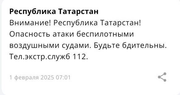 МЧС утром выпустило предупреждение об опасности атаки беспилотников в Татарстане. Информация была опубликована в приложении ведомства в 7:01.