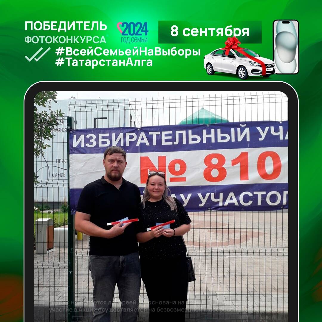 Восьмым победителем республиканского фотоконкурса «Всей семьей на выборы!», который проходит в РТ в день выборов в Госсовет, стала Ландыш Потапова. В профиле женщины в социальной сети «ВКонтакте» указано, что она живет в Альметьевске. Имя обладателя нового iPhone 15 объявили в студии телемарафона «Всей семьей на выборы!» на ТНВ. Участие в конкурсе по состоянию на 15.00 приняли уже 50 443 человека.