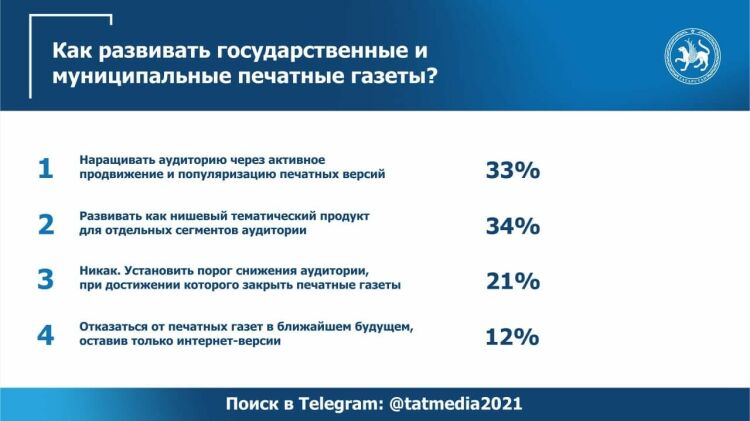 «34% процента аудитории — в данном случае отрасли — считают, что газеты нужно развивать как нишевый тематический продукт. Но 33% опрошенных считает, что нужно наращивать через активное продвижение и популяризацию печатных версий», — объявили результаты опроса.