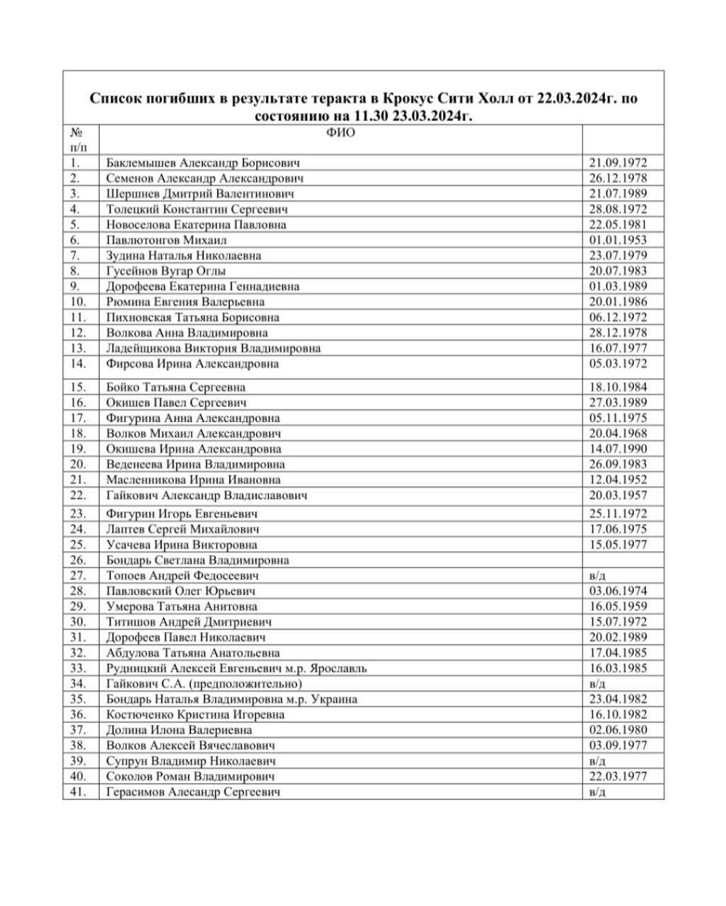 Опубликован обновленный список погибших в «Крокусе», в нем 41 человек