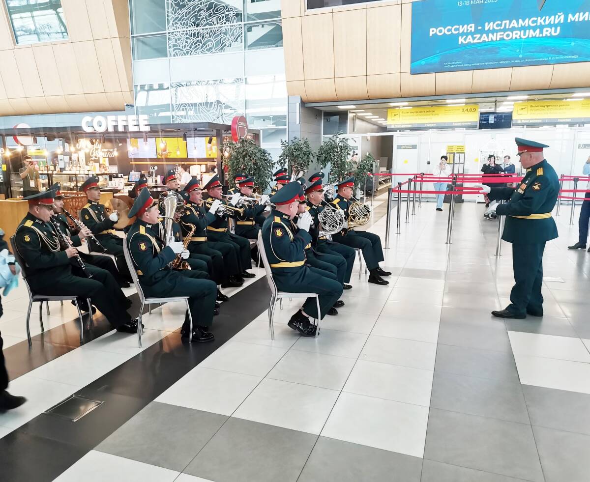 Оркестр Танкового училища выступил в казанском аэропорту к 80-летию Победы