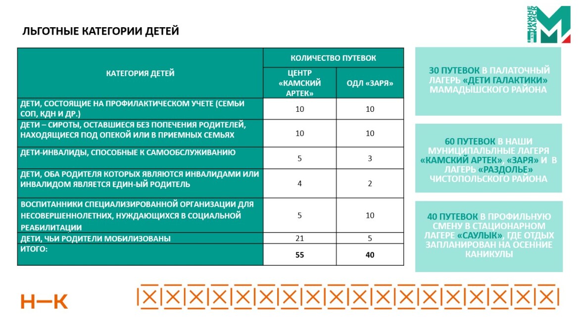 Кроме того, отдых 55 воспитанников детского дома запланирован в лагере «Заря». 25 путевок предназначены для детей из приюта «Балкыш», а еще 25 путевок в лагеря «Камский Артек» и «Заря» — для детей из семей с социально опасным положением.