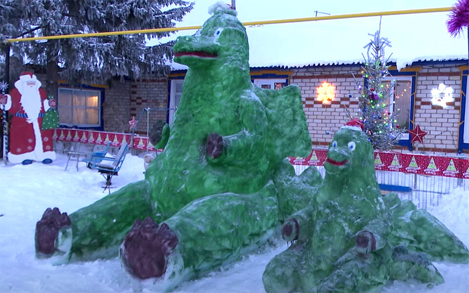 Нурия и Иршат Мударрисовы из села Малая Цильна Дрожжановского района своим творением хотели поддержать ребят, которые участвуют в СВО. Перед своим домом они из снега слепили танки, вырыли окопы. Конечно же, не обошлось и без символа 2024 года — Зеленого Дракона, сказочных персонажей, Деда Мороза и Снегурочки.