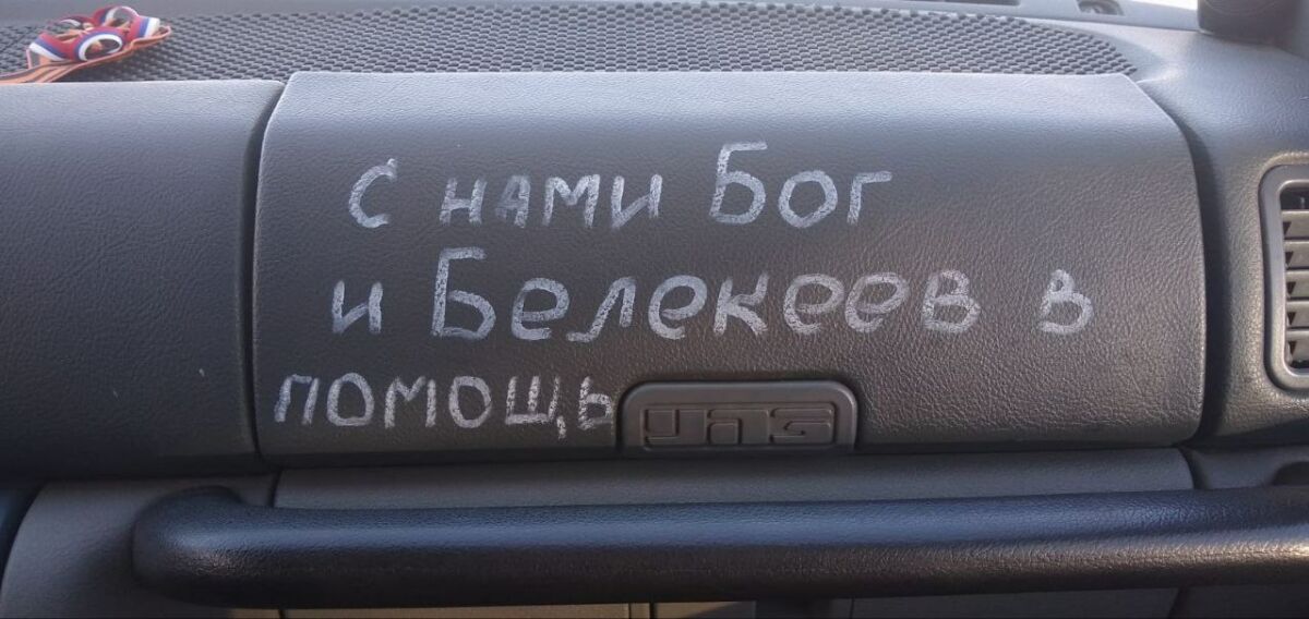 Семья волонтера подарила бойцам свою машину. На крышке бардачка белой краской Оксана написала: «С нами Бог и Белекеев в помощь!». Сейчас авто выполняет роль боевой машины. Так руководитель группы «Сердце цвета хаки» выразила свою любовь и уважение отцу — Александру Ивановичу.